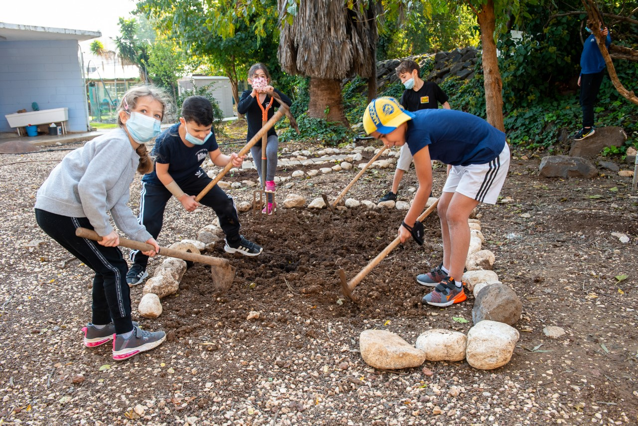 Photo 3: Students at Nachshonei HaHula School in Yesod Hama’ala work on a project outside.