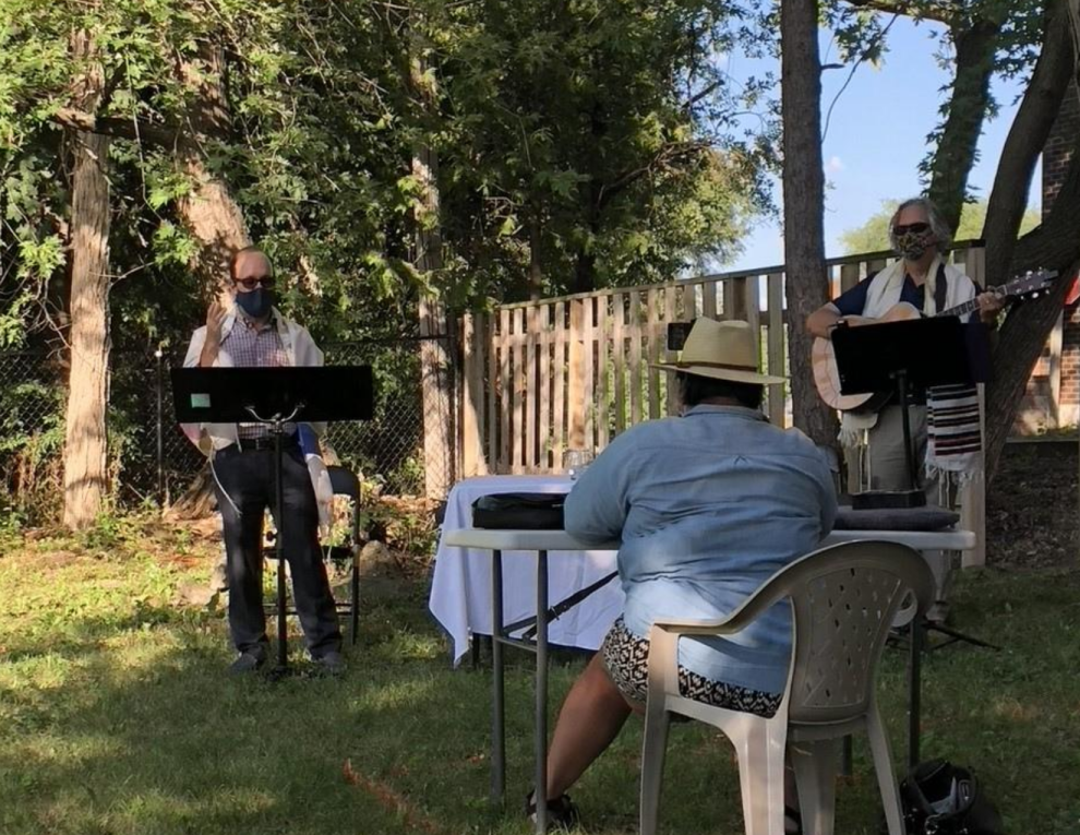 Photo: Ranit Braun streams Temple Israel’s outdoor Kabbalat Shabbat service with Rabbi Daniel Mikelberg and music leader Larry Tarof on Facebook Live, July 24.