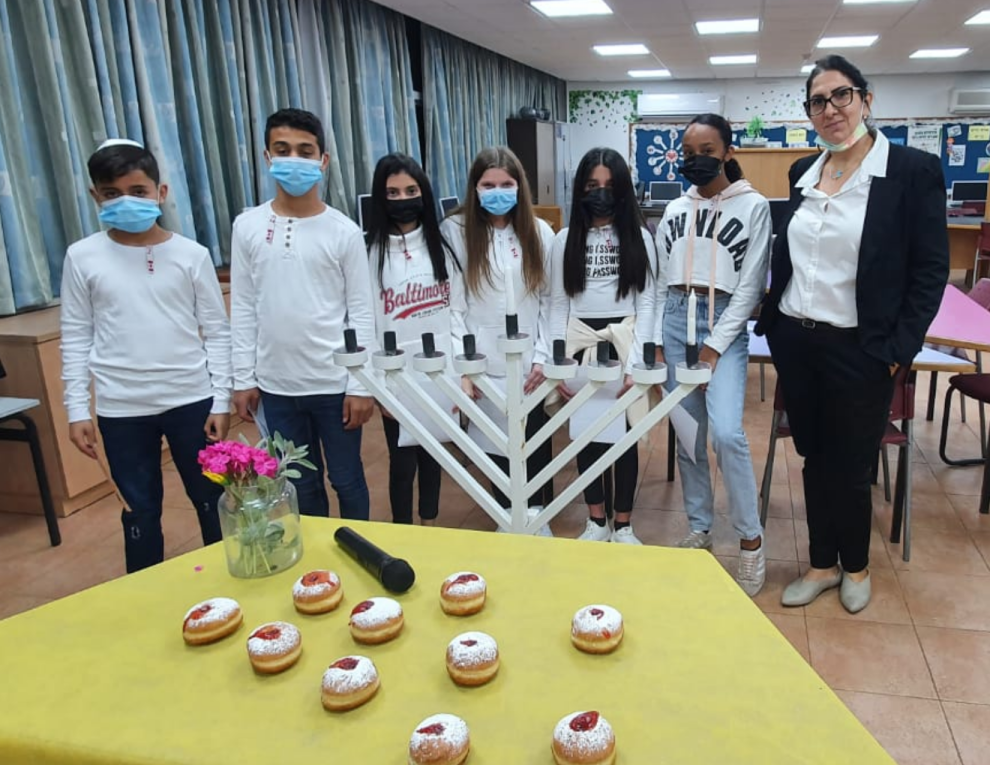 Photo 1: Teacher Hadas Elimelech and some Grade 6 students at Hameganim School in Kiryat Shmona prepare to light the first Chanukah candle. (Click on the image to see its full resolution.)