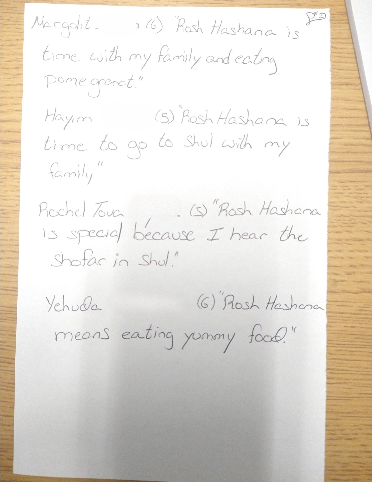 "On Rosh Hashanah my family and I go to Montreal we eat really good lamb.” Anonymous, Grade 5