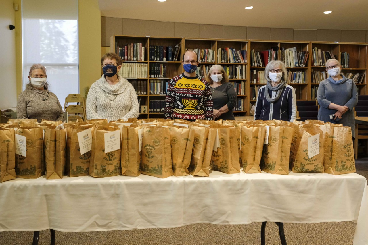 Photo 2: (From left) Merle Haltrecht-Matte, Patsy Royer, Rabbi Daniel Mikelberg, Shirli Penner, Linda Rossman and Miriam Burke prepare “Taste of Chanukah” goody bags at Temple Israel, December 6, 2020.