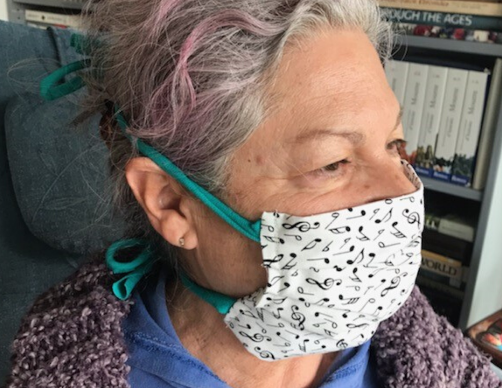 Photo 1: Merle Haltrecht-Matte wears a mask she sewed.
