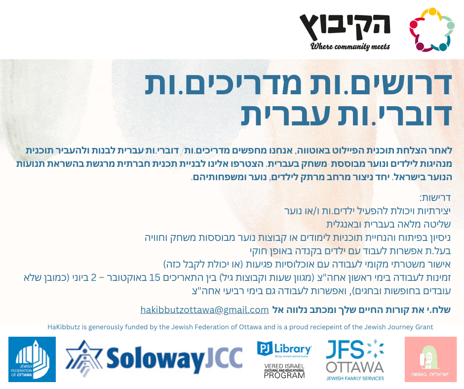 “Kibbutz” comes from the root Kuf (ק), Bet (ב), Tsadik (צ) meaning bringing different elements together. It’s about bringing together our community to explore, experiment, and discover what it means to raise the next generation of Canadian-Israeli children and youth in Ottawa in a non-religious and non-political environment.
