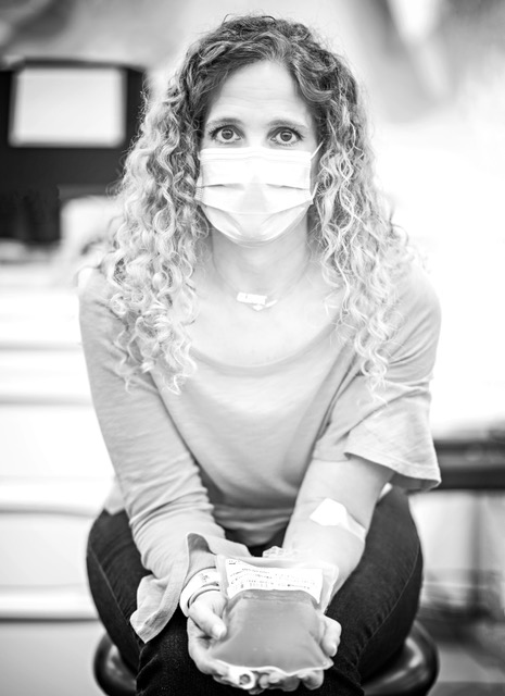 Photo: Glenna Gosewich recently donated a portion of her liver to save another person's life. Glenna has donated blood 106 times and plasma 13 times. In the full photo below, she is shown holding plasma she donated at the Héma Québec clinic last June.