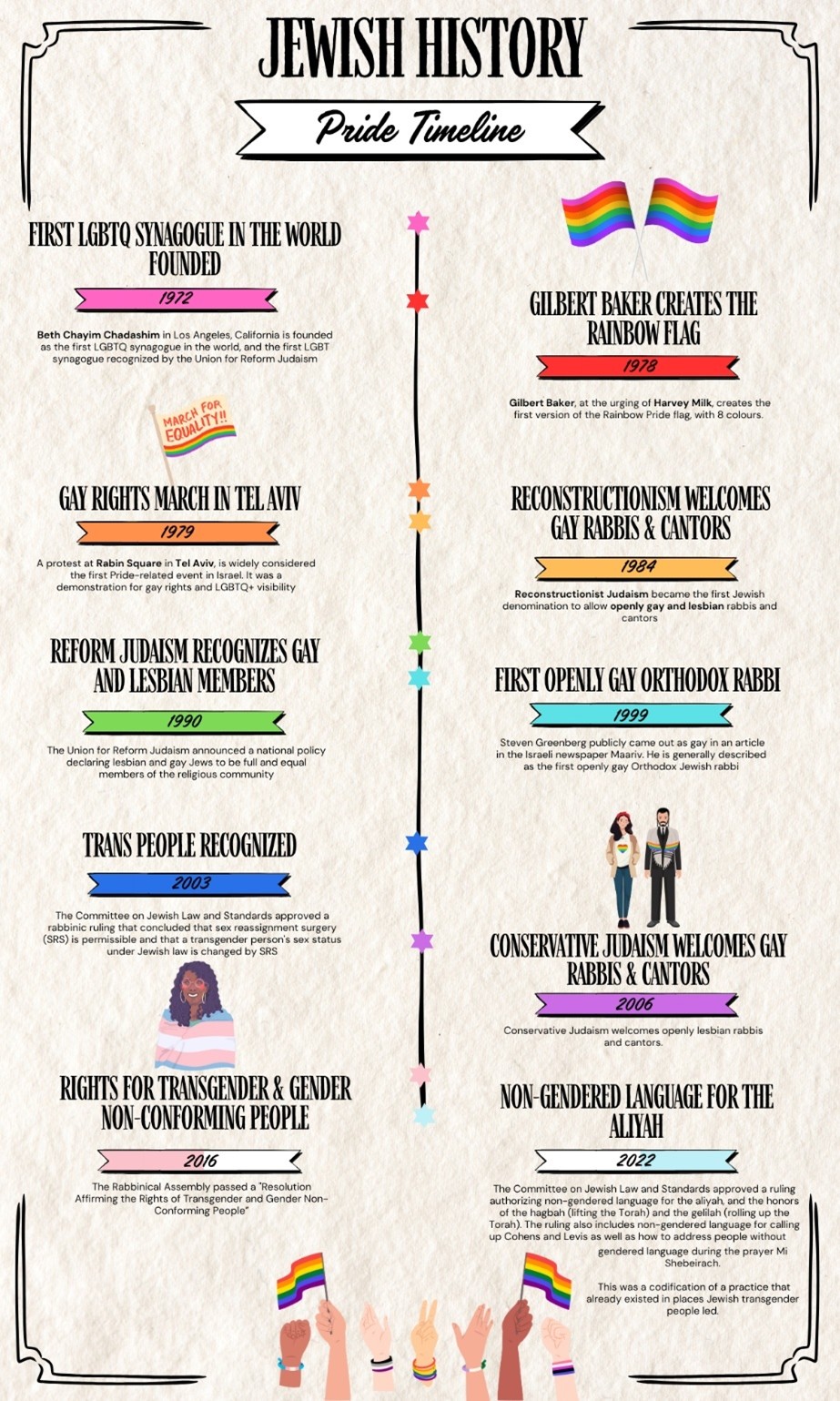 As we honour the vibrant contributions of queer Jews past and present, we also reflect on the ongoing work of building truly inclusive and welcoming Jewish spaces. The history that follows is a testament to that journey and a reminder that inclusion in Jewish life has been hard-won and remains a responsibility for us all.