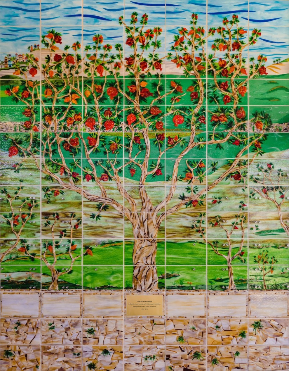 The Israeli-Canadian couple – who operate Ravek Architectural Glass Art – chose pomegranate trees as the focus of the mural because they are “synonymous with ancient Israel” and would “symbolize the strength and beauty of the community and the various people that make it up,” explained Oded.
