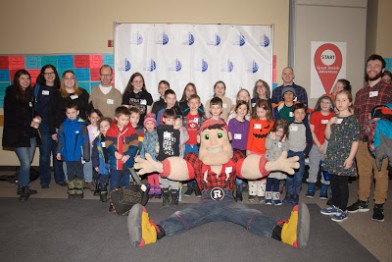 Ottawa Redblacks mascot Big Joe shares a moment with a group of Mitzvah Day participants, February 2, at the Soloway Jewish Community Centre. (Howard Sandler)