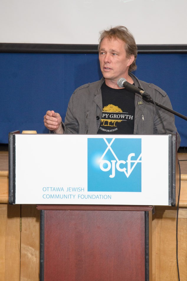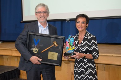 Outgoing Federation Chair Hartley Stern receives tokens of appreciation for his service from Past-Chair Linda Kerzner at the Jewish Federation of Ottawa annual general meeting, June 19. (Howard Sandler)
