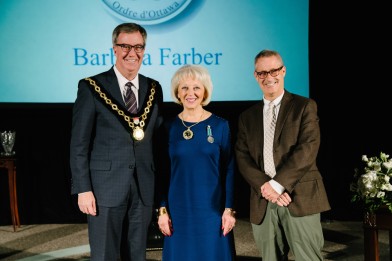 Order of Ottawa inductee Barbara Farber with Mayor Jim Watson (left) and Councillor Keith Egli at the induction ceremony, November 22, at Ottawa City Hall. (City of Ottawa)