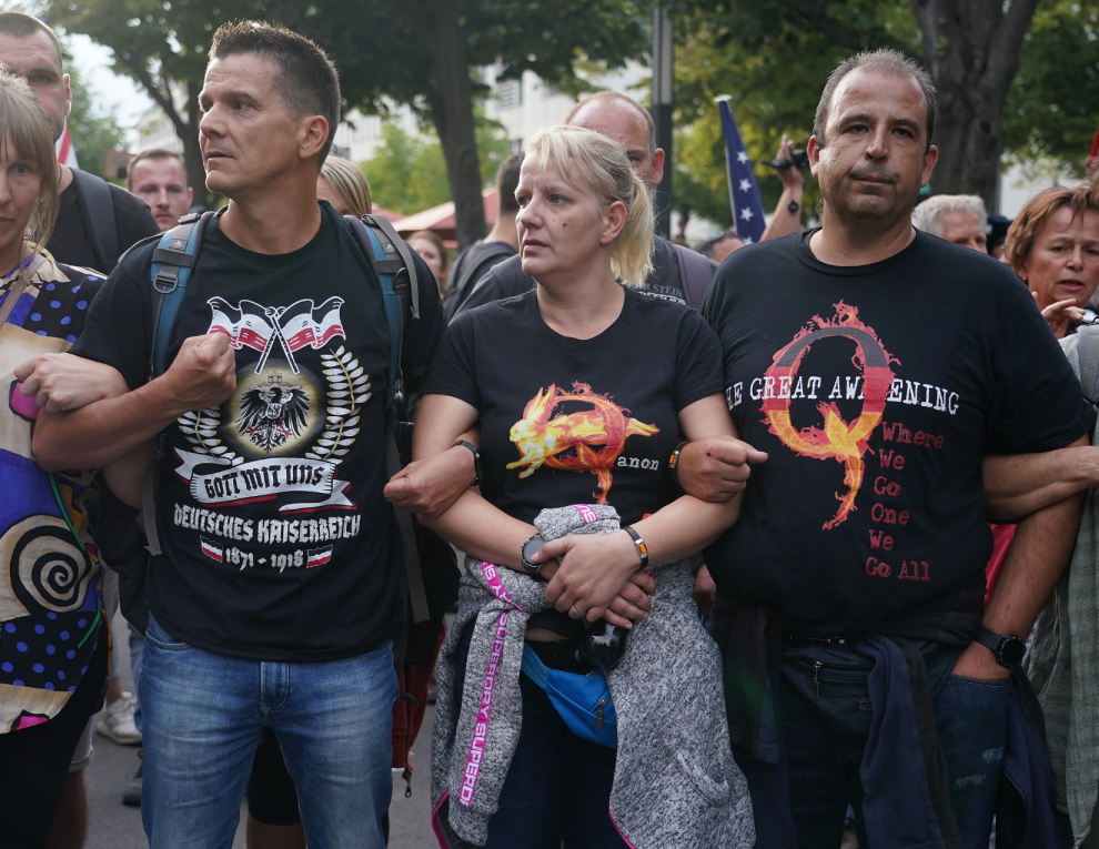 Photo: A group of Germans who follow the QAnon conspiracy theory protest in Berlin, Aug. 29, 2020. That day, inspired by QAnon, a group of German extremists stormed the country's parliament. (Sean Gallup/Getty Images)