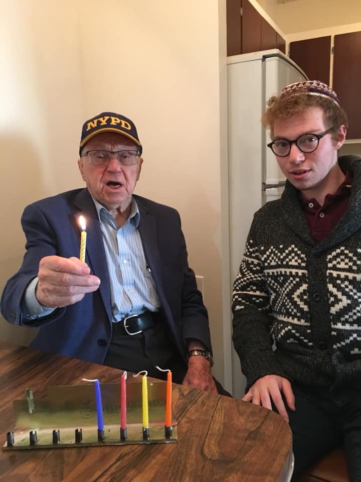 Photo: Jesse Wolfsohn and his grandfather, Arthur, light Chanukah candles last December.
