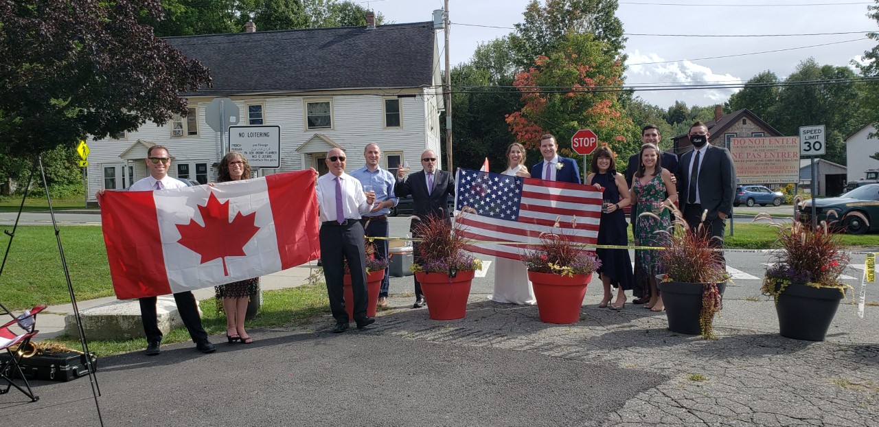 To allow both the bride and groom’s immediate family to attend, the couple instead had their wedding ceremony on September 6 outside the Haskell Free Library and Opera House. This unique building straddles the Canada-U.S. border at Stanstead, QC and Derby Line, VT, about 350 kilometres from Ottawa. The border line is demarcated by a row of flower pots and rocks under the watch of Canadian and U.S. border authorities.